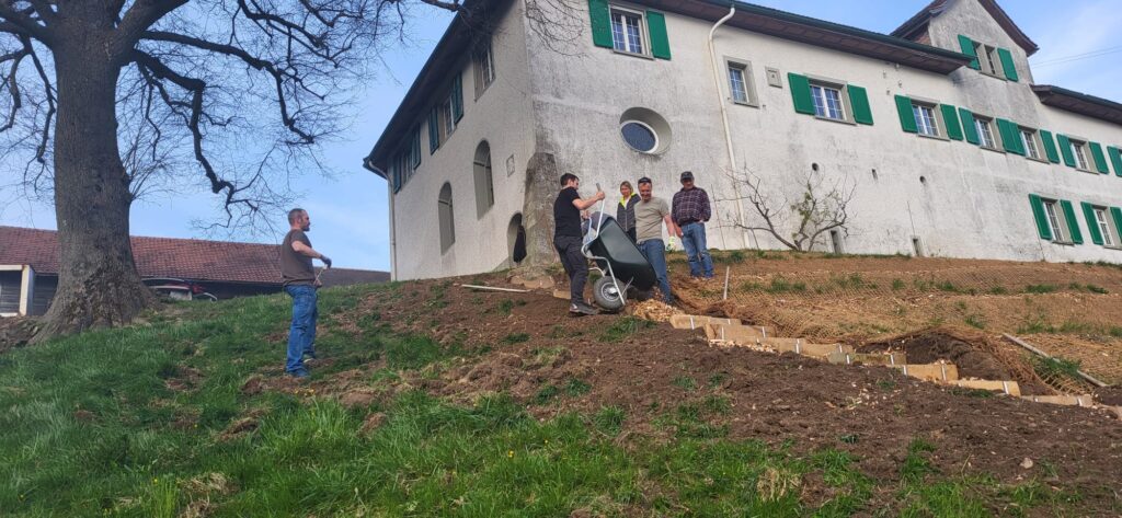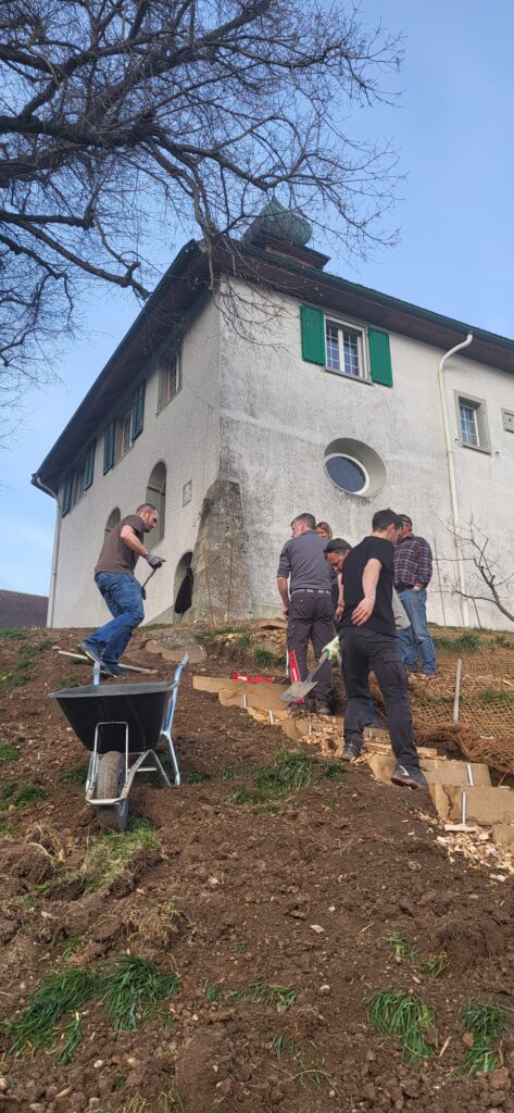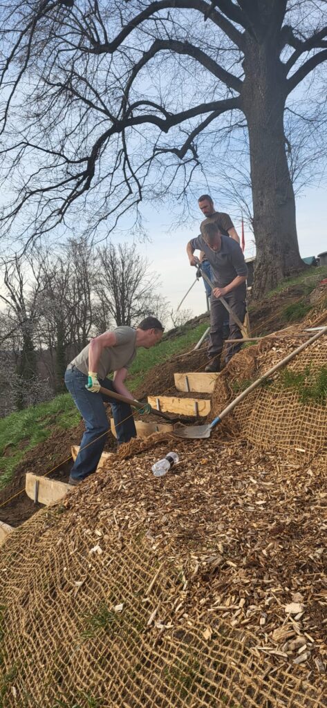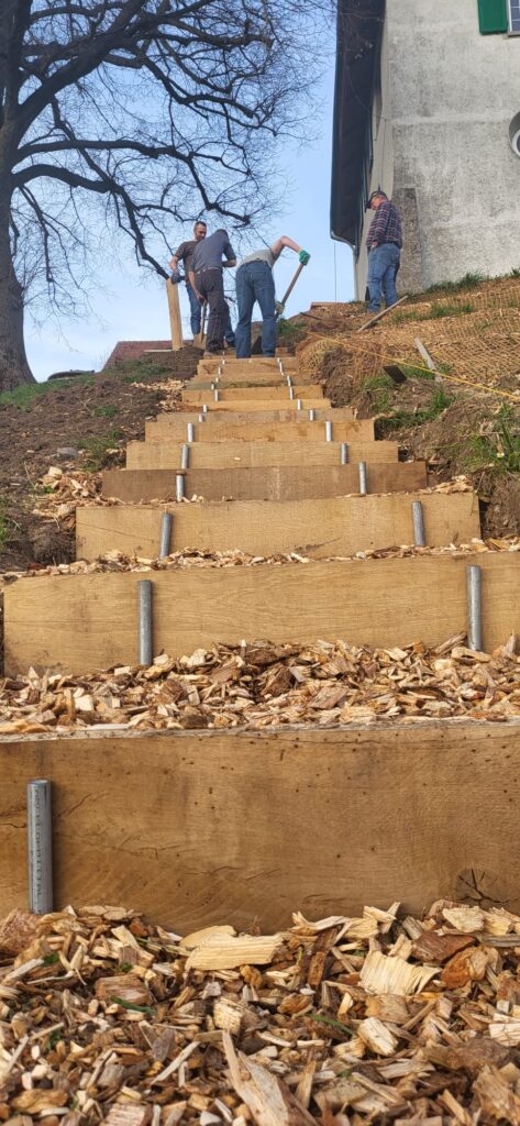 Natürlich benötigen wir auch eine Treppe um die einzelnen Etagen möglichst einfach erreichen zu können. Mit System hat unser Treppenbau-Team Tritt für Tritt in den Hang geschaufelt und gehackt.